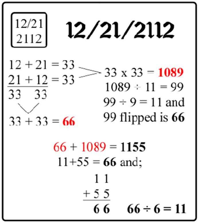 - And 12/21/2112 contains 11 11 22 22 which also total 66!