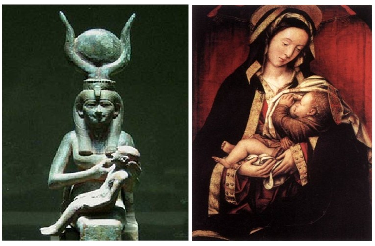 The famous image of a mother sitting on a throne with suckling child comes from Isis and her son Horus which like many ancient mythologies often mirror much of what’s written in the bible. In this case with Mary and Jesus;