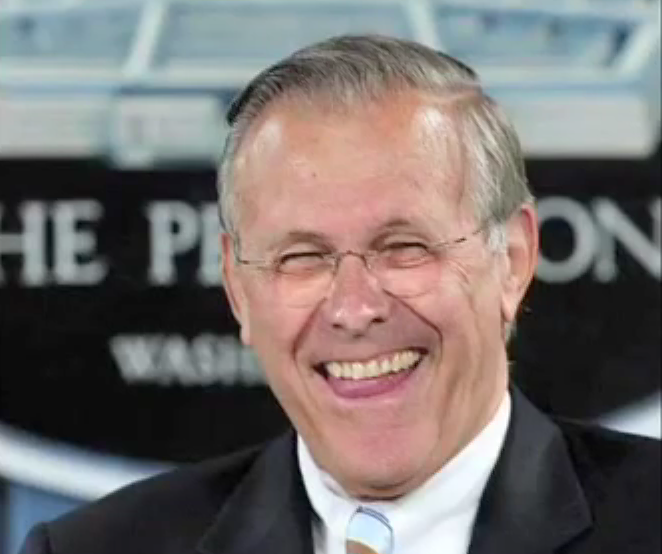 That’s the psychotic piece of shite Rumsfeld who lost stole that 3.3 Trillion Dollars that the pentagon was investigating before the exact office was one of the few hit on 9/11 thereby supposedly destroying all the records. He also brought torture back for the new millennium and started the bogus Iraq war for dregs.
