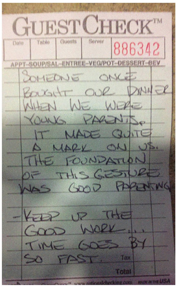 This note that was handed to a waiter along with a $20 bill by an elderly lady in his restaurant.